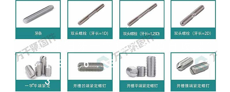 1 六角頭螺栓 六角頭螺栓 種類很多,應用最廣,精度分為:A、B、C三級,通用機械中多選用C級。螺栓桿部可制成一段螺紋或全螺紋,螺紋可用粗牙或細牙。2 雙頭螺柱 雙頭螺柱 螺柱兩端都有螺紋,兩端螺紋可相同或不同。螺柱可帶退刀槽或制成腰桿,也可制成全螺紋的螺柱。螺柱的一段常用于旋入鑄鐵